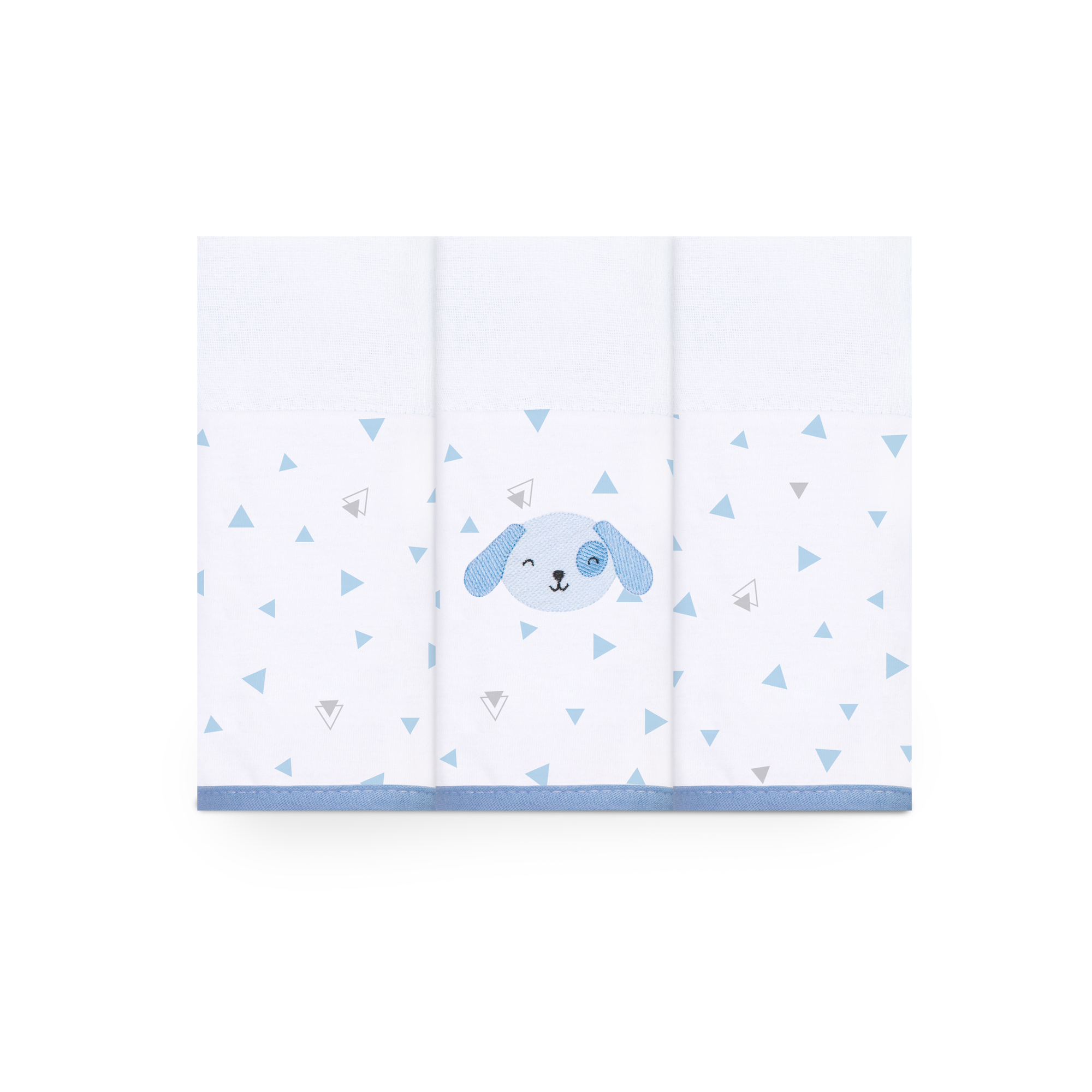 A faixa é costurada na borda da fralda, é estampada e vem com o rostinho de um bichinho bordado. Escolha entre 4 opções de cores e bichinhos: azul de cachorrinho, rosa de gatinha, creme de ursinho e cinza de coelhinho.